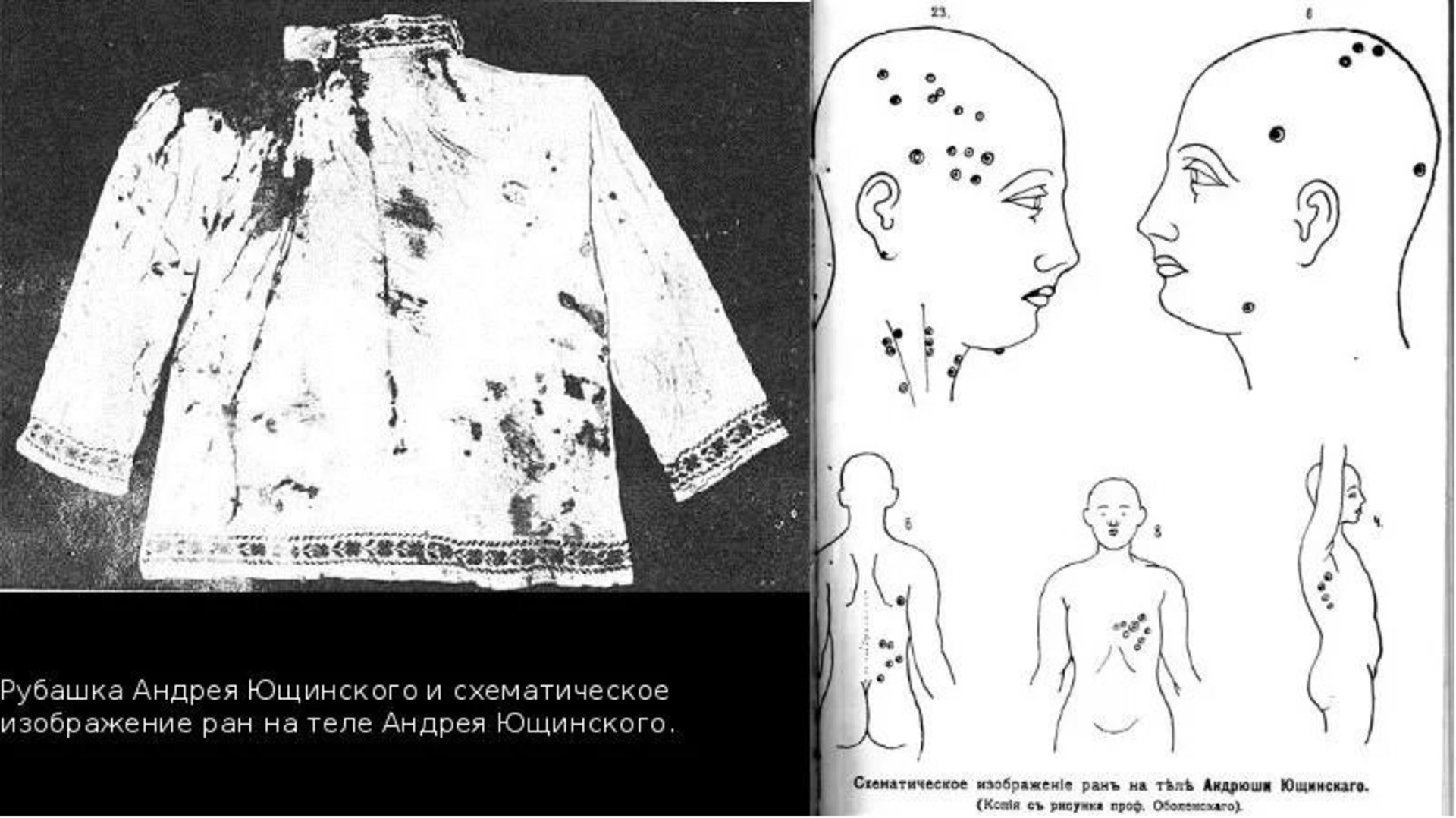 В известной обличительной книге Лютостанского описаны следующие условия ритуальных убийств. Они совершаются перед еврейской Пасхой с целью добыть «пейсаховую» кровь; последняя употребляется для изготовления «мацы», вливается также в вино и служит для многих других надобностей. «Агнцем» должен быть непременно христианский мальчик не старше 13 лет (еврейское совершеннолетие). Убивают его пять лиц. Предварительно мальчик подвергается сильнейшим мучениям, для чего ему наносят уколы в разные части тела. Раньше хасиды распинали свою жертву, но затем сочли достаточным только вбивать в различные части тела гвозди. Кровь выпускается непременно во время мучения и непременно до смерти жертвы. Во время истязания и вытачивания крови мальчик должен быть голым и стоять на ногах, для чего его поддерживают. Руки мальчика крепко связываются, а рот зажимается. Кровь выпускают из шейных вен, после чего мальчику наносится удар ножом в область сердца. По окончании обряда труп мальчика одевают. Зарывать труп считается тяжким грехом, ибо по понятиям Евреев мёртвый христианин есть падаль, которую надлежит выбросить на съеденье птицам и зверям. Такова обстановка ритуальных убийств. Она полностью до мельчайших деталей установлена в смерти мальчика Ющинского, по признанию врачей. Он был не сразу убит, а замучен; на теле его в разных частях оказалось 45 колотых ран. Последние наносились ножом, четырёхгранным гвоздём (гвозди забивались, между прочим, в голову) и чем-то тонким, вроде, шила. Кровь из мальчика выпущена вся; вследствие этого он две недели почти совсем не подвергался разложению. Как точно установил проф. Н. А. Оболонский, во время мучений мальчика удерживали в стоячем положении, при этом он был голым. Руки мальчика были крепко связаны на спине, рот зажат, шейные вены вскрыты ножом и пр. и пр.